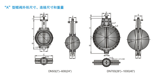 注:DN50(2’)~ 800(32’)“A”型蝶阀分别适用于PN1.0/PN1.6MPa两种压力等级,表中每格两种尺寸分别表示PN1.0/PN1.6MPa的连接尺寸,与阀门连接